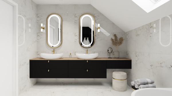 - Oświetlenie LED – stosowane jako podświetlenie luster, szafek i nisz.